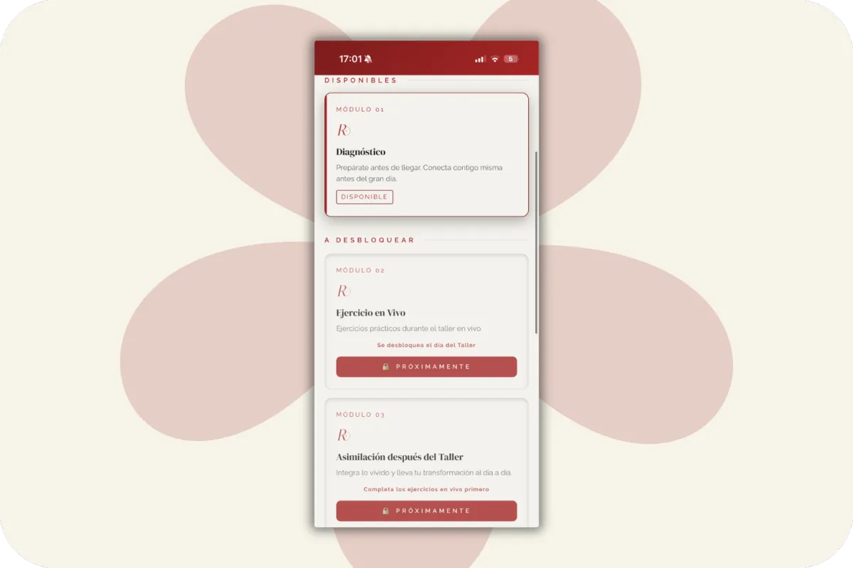 Antes del taller podrás completar un diagnóstico personal dentro de la app, que te ayudará a identificar los patrones y creencias que están influyendo en tu vida hoy.