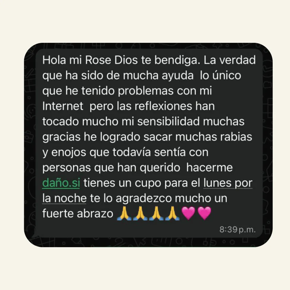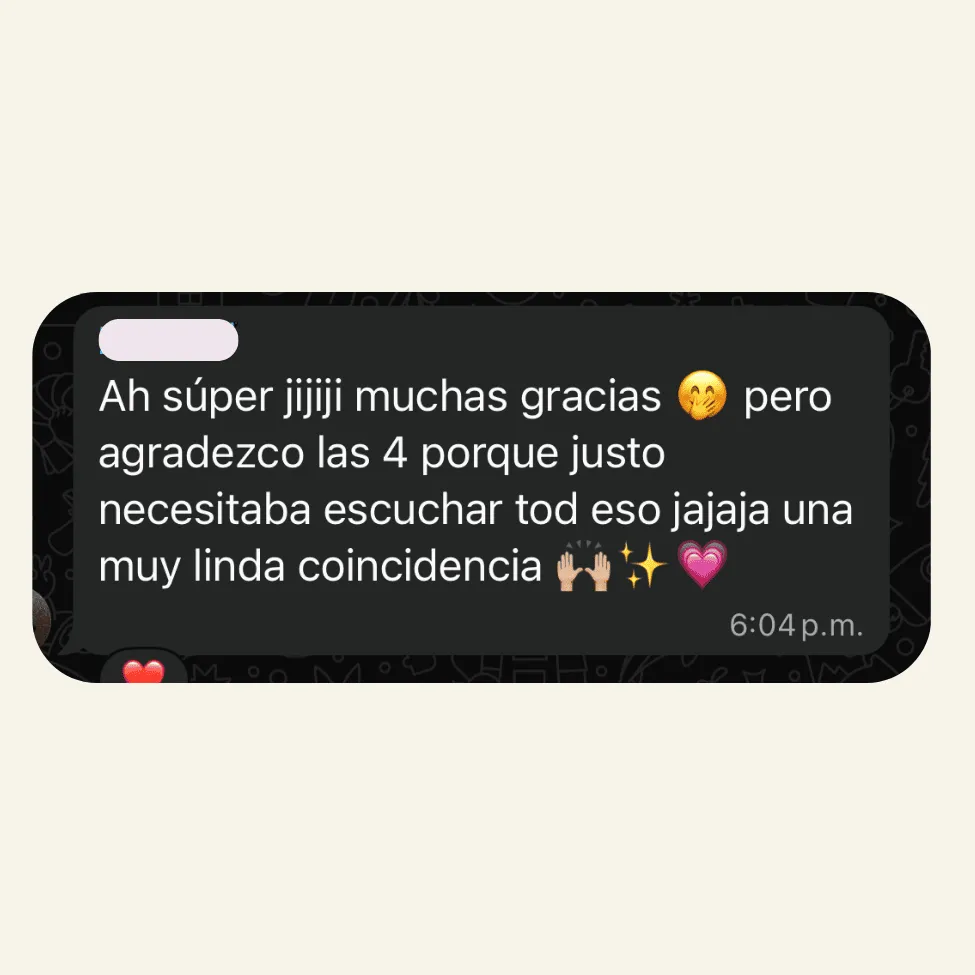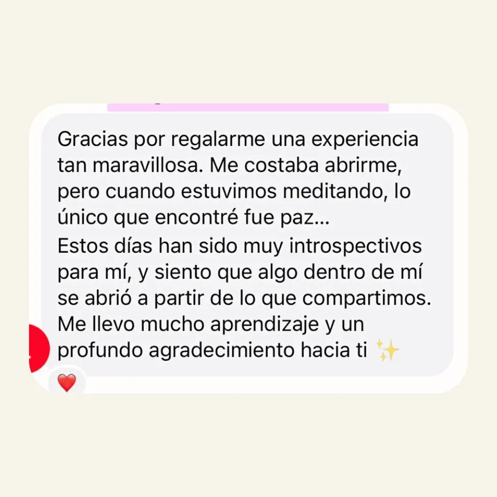 Después del taller tendrás una sesión privada conmigo para integrar lo que surgió durante la experiencia, profundizar en tus descubrimientos y ayudarte a llevar esa claridad a tu vida diaria.